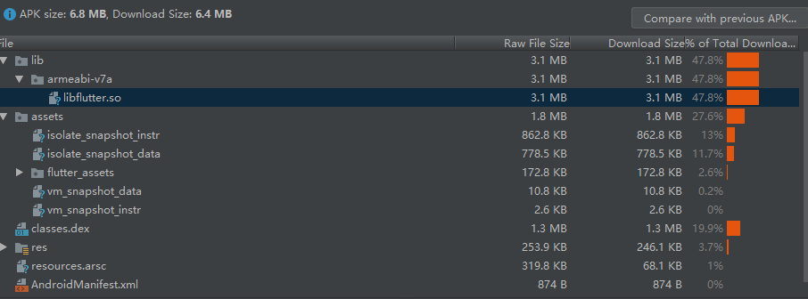 接入Flutter之后,包大小激增5M,主要是因为flutter.so这个so库。还有flutter_assets里是flutter工程产生的assets文件, isolate_snapshot_data、isolate_snapshot_instr、vm_snapshot_data、vm_snapshot_instr为特定平台的数据和指令.