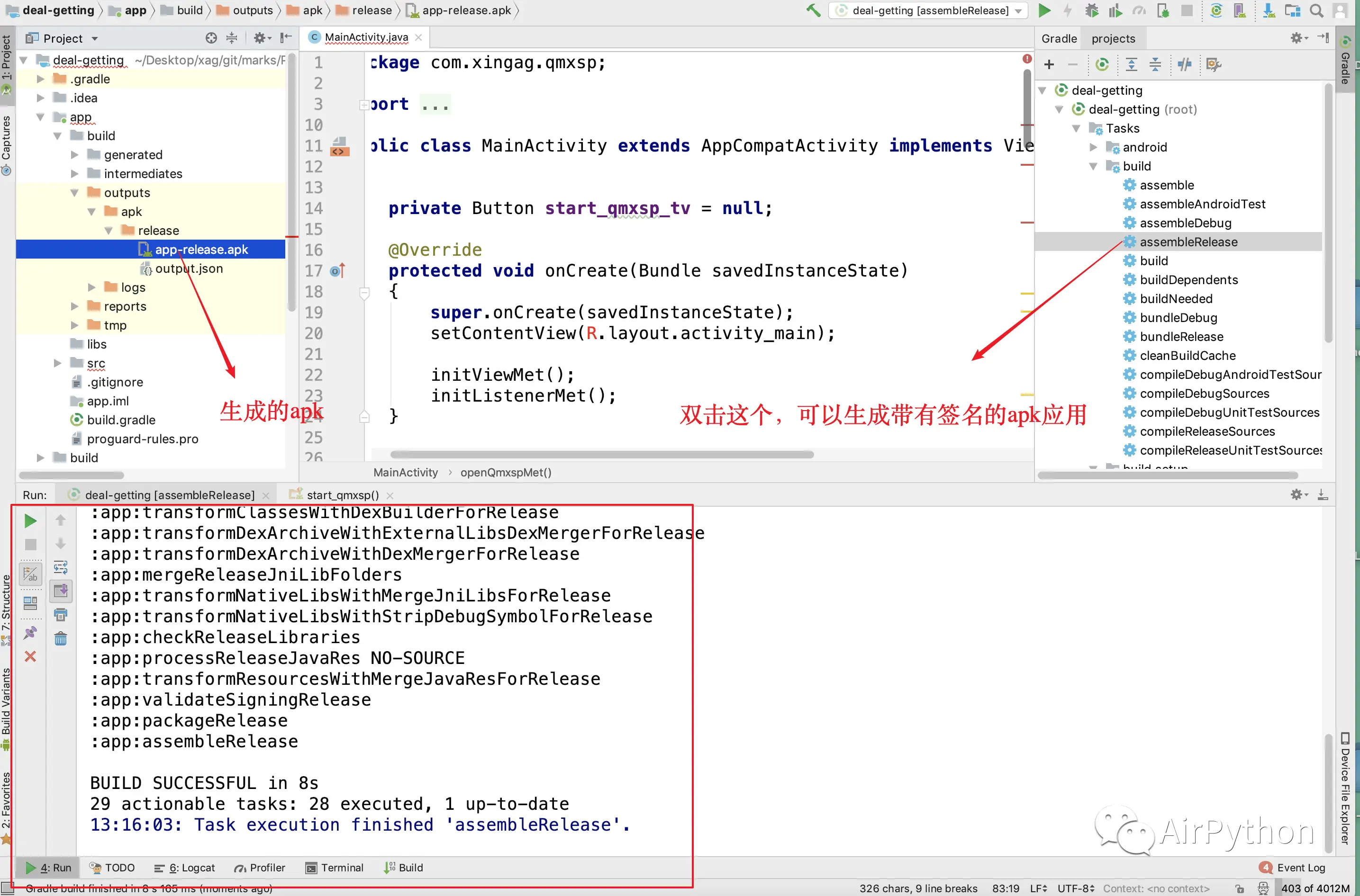 最后,可以直接运行项目后,会在手机上生成一个应用;或者可以通过 AS 工具生成一个带有签名的应用 APK,然后再利用手机助手安装到手机上。