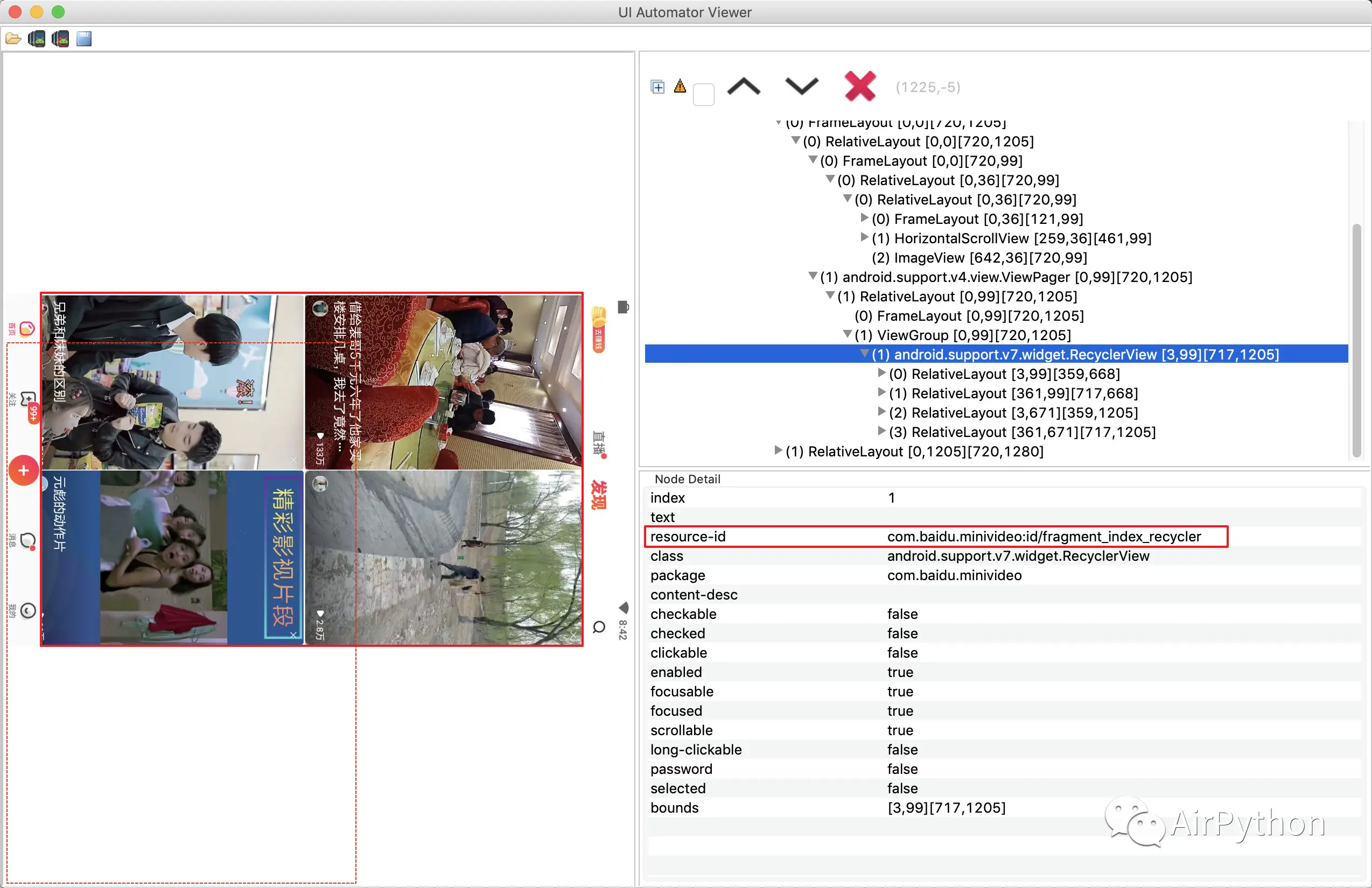 UiObject2 rv = mDevice.findObject(By.res("com.baidu.minivideo:id/fragment_index_recycler"));