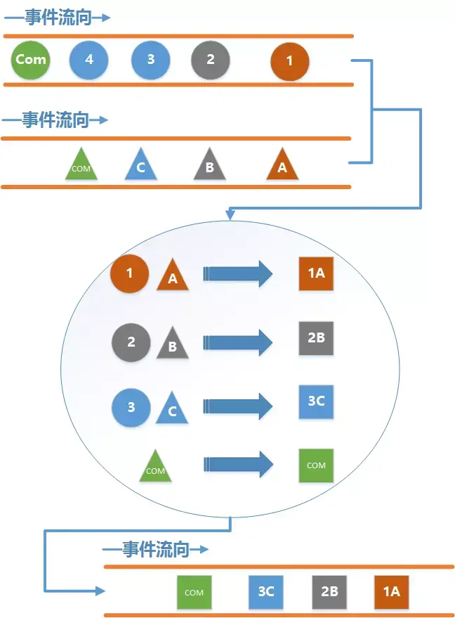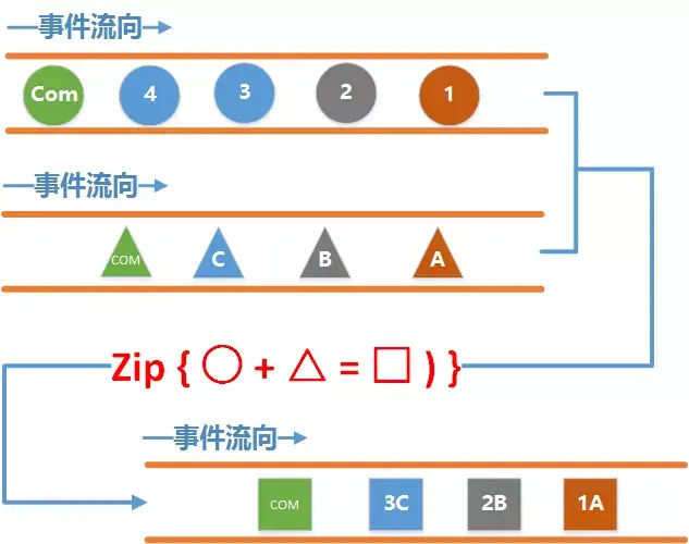 分别从两根水管里各取出一个事件来进行组合, 并且一个事件只能被使用一次,组合的顺序是严格按照事件发送的顺利来进行的, 也就是说不会出现圆形1事件和三角形B事件进行合并, 也不可能出现圆形2和三角形A进行合并的情况. - 最终