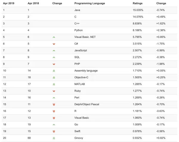 2019年4月份的TIOBE指数已经更新,西加加超越大蟒蛇重新回到探花位置,状元还是老流氓爪哇,榜眼还是西。