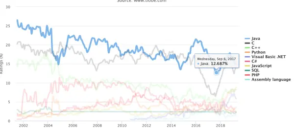 从下图的趋势中可以看到,2017年6月python的指数是2.983,此时的Java是12.637,Java大约是Python的4.23倍。最新4月份的指数中,Java不到Python的2倍。可预见随着时间的增加,差距依然会越来越小。