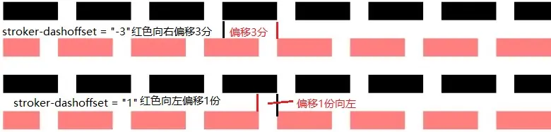 翻译过来简单来说就是这个属性设置了与之关联的dash数组的偏移量。也就是上面的stroke-dasharray属性中这个数列。这个属性相对于绘制的起点偏移的量,正值(向右或者顺时针偏移),负值(向左或者逆时针)。