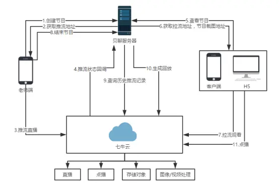 - 看宝宝与明日之星是贝聊的视频直播产品,目前只是使用七牛一家的直播云服务。基本业务是通过摄像头设备或老师的手机直播,推流到七牛,家长通过H5的页面观看。业务流程图如下: