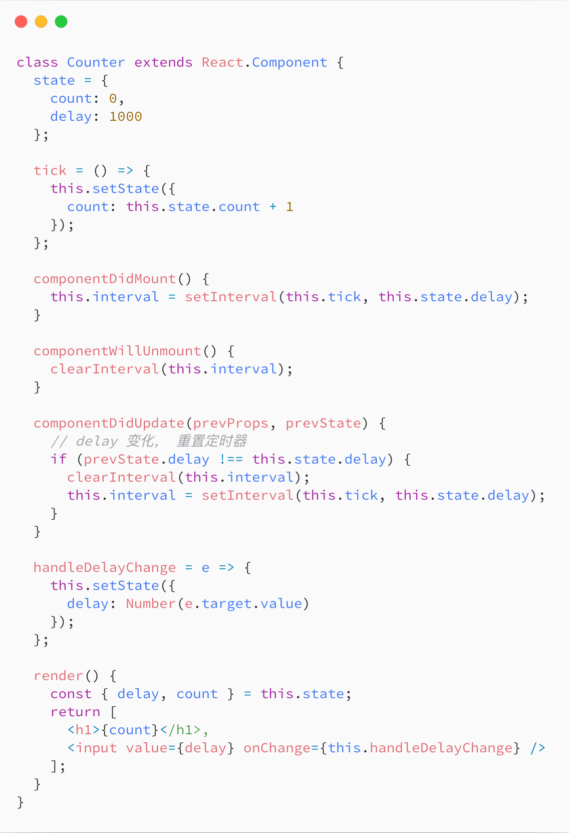 那如果我们在每次 render 的时候动态地改变 setInterval(fn, delay) 中 fn 函数, 使这个函数带上最新的 props 和 state, 并且这个 fn 函数要能在多次 render 之间可持续(persist), 这样 setInterval 执行的时候, 就可以实时的读取这个函数拿到最新的值了