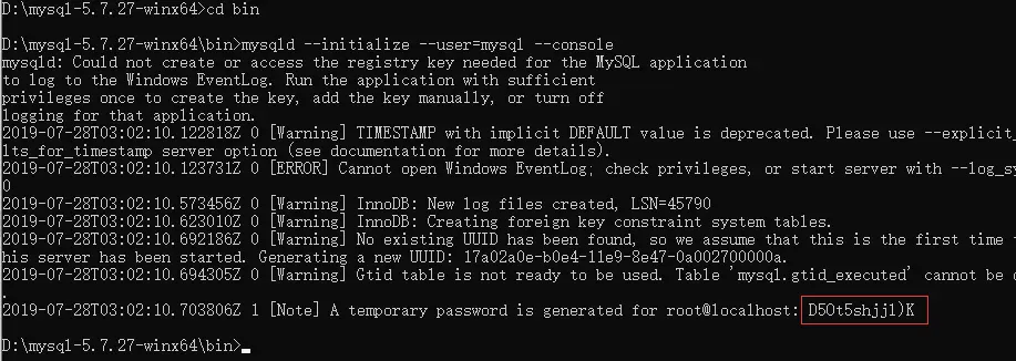 mysqld --initialize --user=mysql --console会得到如下随机密码,用于初次登陆mysql