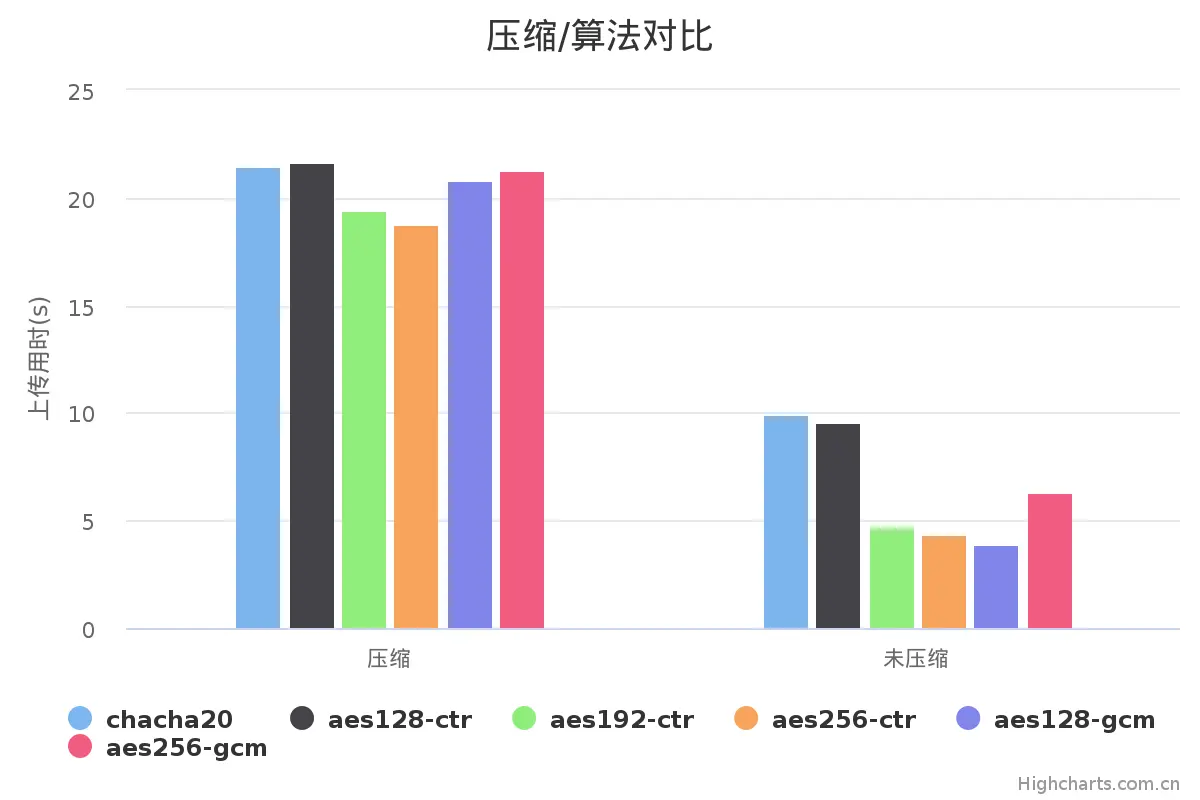 sshpass -p "${PASSWORD}" scp <-c aes-xxx> <-C> ${UPLOAD_FILE} root@${IP}:${WORKDIR}加密算法用于保护你的数据,理论上当然是越弱速度越快,但是对你数据的保护相对应也就越少,默认情况下scp使用aes-128算法,接下来我会选择常用加密算法,分别在有/无压缩下对比