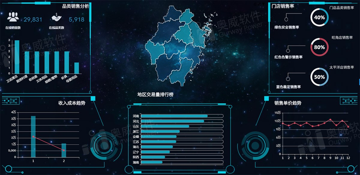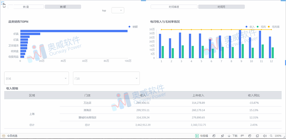 相对以前来说,当前的可视化分析软件基本上都能满足易操作这一点要求。如奥威BI系列的BI产品,不管定位如何,基本上都属于拖曳性布局、点击式操作模式。如分析图表的布局、大小等可通过拖曳式操作完成,而线条粗细、颜色、字体等都需在选择目标图表的前提下在属性项进行个性化设置。