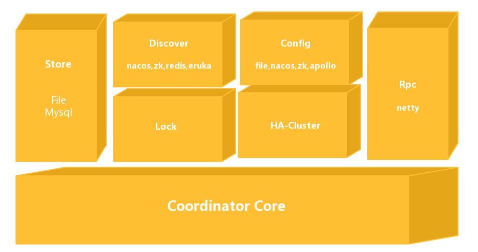 - Coordinator Core:最下面的模块是事务协调器核心代码,主要用来处理事务协调的逻辑,如是否 Commit、Rollback 等协调活动。