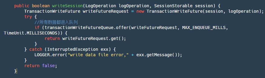 step2:将这个 futureRequest 丢进一个 LinkedBlockingQueue 中。为什么需要将所有数据都丢进队列中呢?当然这里其实也可以用锁来实现,在另外一个阿里开源的 RocketMQ 中使用的锁。不论是队列还是锁,他们的目的是为了保证单线程写,这又是为什么呢?有人会解释说,需要保证顺序写,这样速度就很快,这个理解是错误的,我们的 FileChannel 其实是线程安全的,已经能保证顺序写了。保证单线程写其实是为了让这个写逻辑都是单线程的,因为可能有些文件写满或者记录写数据位置等等逻辑,当然这些逻辑都可以主动加锁去做,但是为了实现简单方便,直接再整个写逻辑加锁是最为合适的。