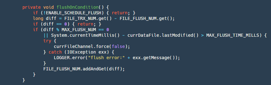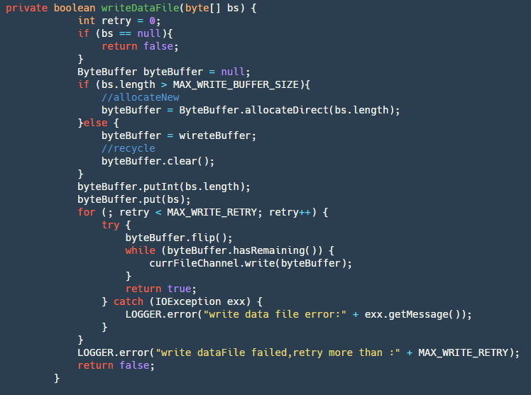 step3:最后将 ByteBuffer 写入 fileChannel,这里会重试三次。此时的数据还在 pageCache 层,受两方面的影响,OS 有自己的刷新策略,但是这个业务程序不能控制,为了防止宕机等事件出现造成大量数据丢失,所以就需要业务自己控制 flush。下面是 flush 的代码:
