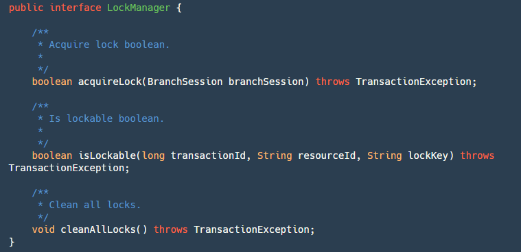 Lock 模块也就是 Seata 实现隔离级别的核心模块。在 Lock 模块中提供了一个接口用于管理锁: