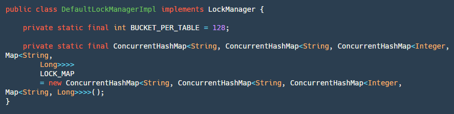 可以看见实际上的加锁在 bucketLockMap 这个 Map 中,这里具体的加锁方法比较简单就不作详细阐述,主要是逐步的找到 bucketLockMap ,然后将当前 trascationId 塞进去,如果这个主键当前有 TranscationId,那么比较是否是自己,如果不是则加锁失败。