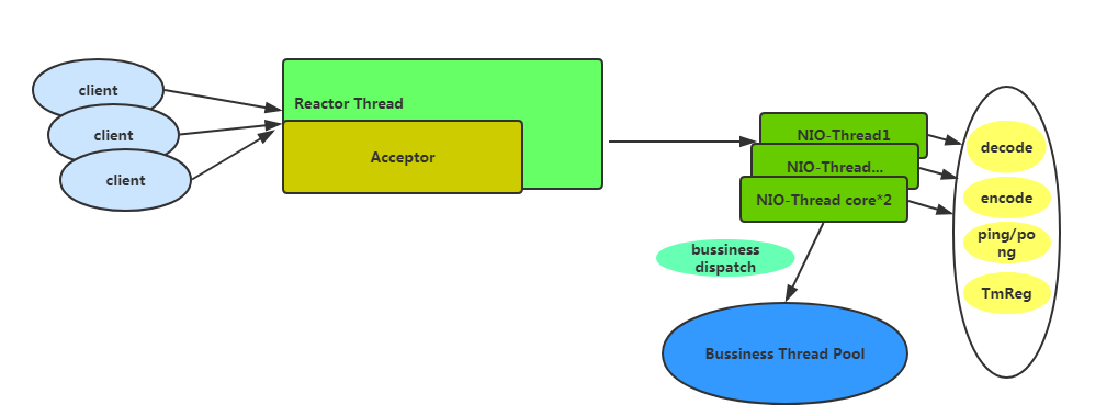 如果采用默认的基本配置那么会有一个 Acceptor 线程用于处理客户端的链接,会有 cpu*2 数量的 NIO-Thread,再这个线程中不会做业务太重的事情,只会做一些速度比较快的事情,比如编解码,心跳事件和TM注册。一些比较费时间的业务操作将会交给业务线程池,默认情况下业务线程池配置为最小线程为 100,最大为 500。