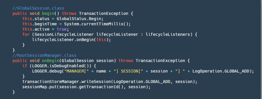 一次分布式事务的起始点一定是开启全局事务,首先我们看看全局事务 Seata 是如何实现的: