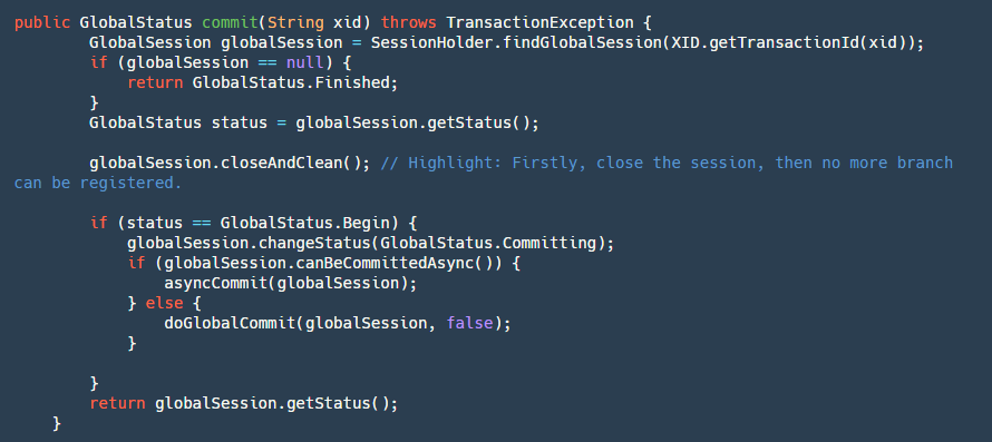 step1:首先找到 globalSession。如果他为 Null 证明已经被 commit 过了,那么直接幂等操作,返回成功。