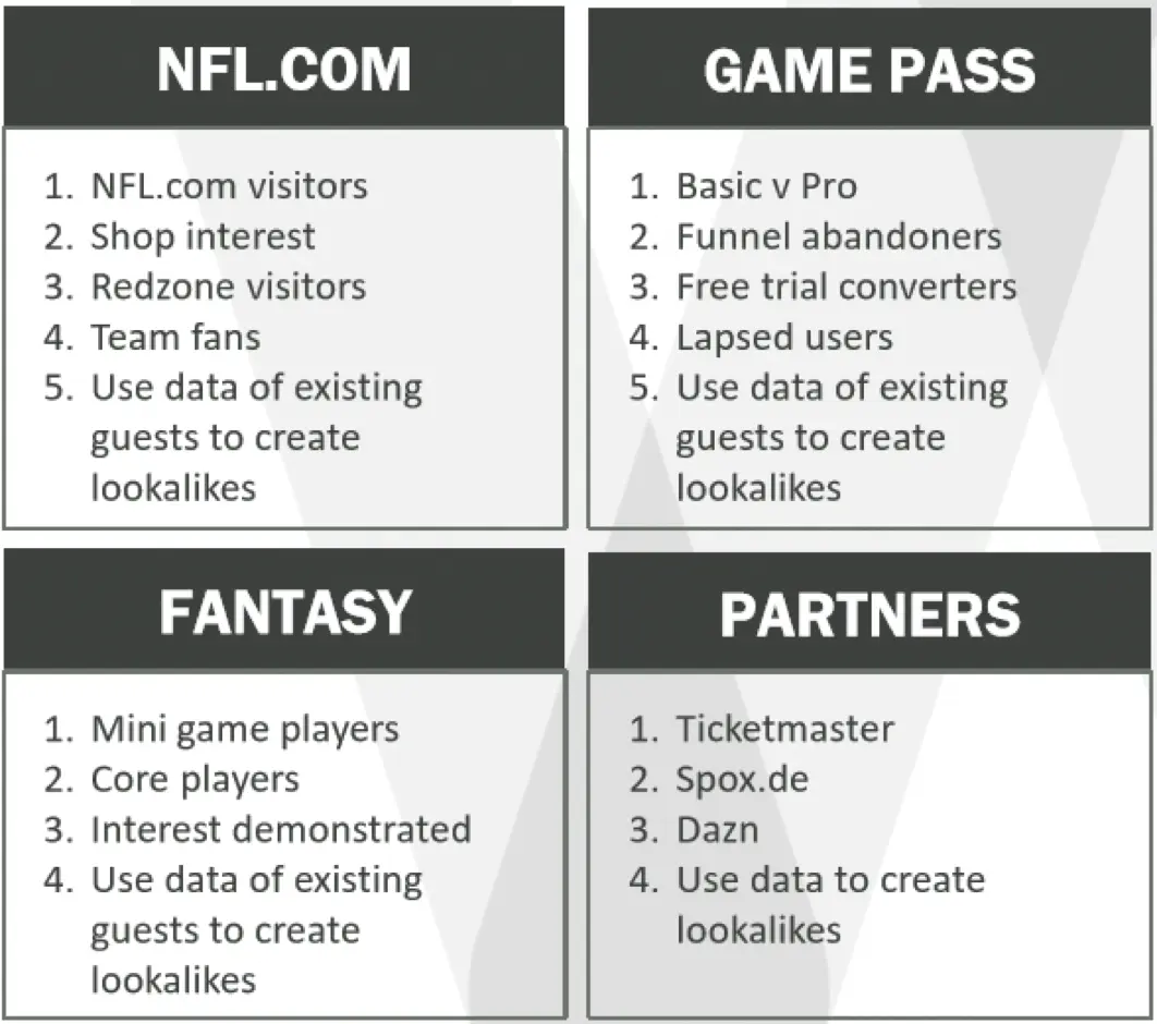 NFL Game Pass Europe的订户收购营销活动中最大的组成部分是数字广告,每季占收购订户的约46%。该活动通常在NFL季前赛(8月)开始,并在NFL赛季(9月)的前4周达到峰值强度,最终在超级碗(2月初)之后结束。该活动中部署了各种付费营销渠道,主要是Google广告(搜索/ PPC),Facebook和YouTube(社交)以及各种程序化展示广告合作伙伴(展示广告)。此外,展示广告在www.nfl.com和NFL免费拥有的其他数字资产(O&O)上发布。预算,广告创意和受众群体定位策略因渠道而异,在整个广告系列中获得平衡对其成功至关重要。