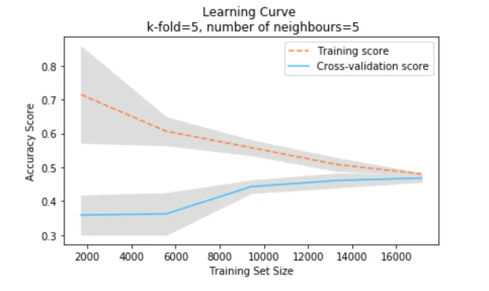 plt.title("Learning Curve \n k-fold=5, number of neighbours=5")