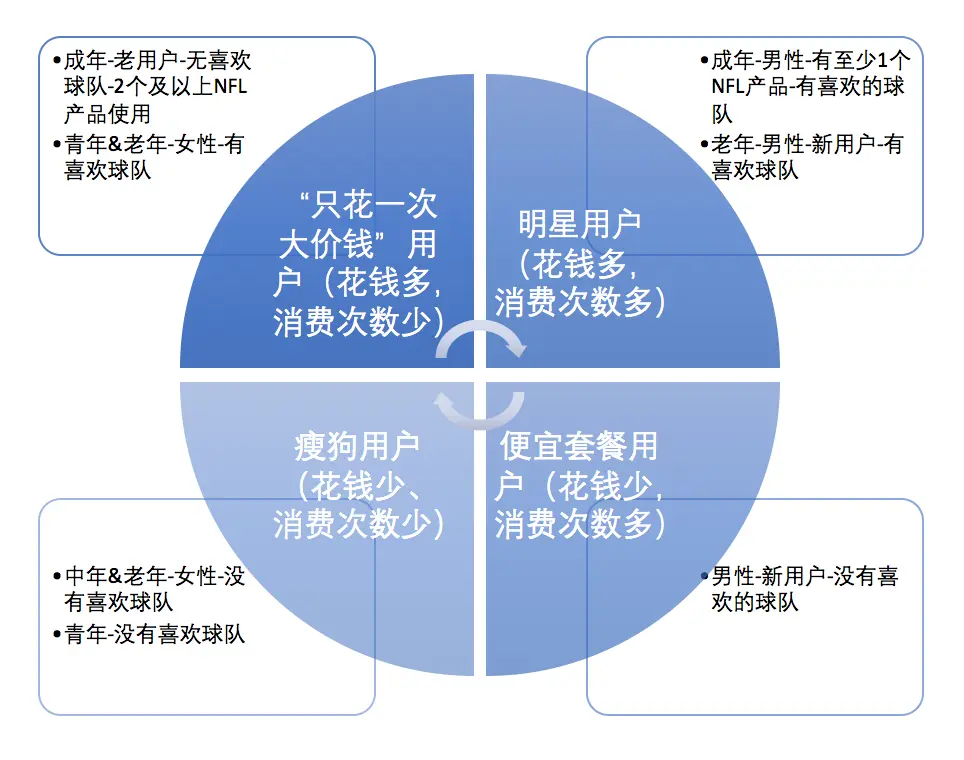 基于英国在Game Pass欧洲市场战略的地位,其目的应该是让越来越多的人参与到NFL中的同时,提高ROI。因此,在不考虑Budget的情况下,应该想办法改进四个群体的消费额与用户体验。