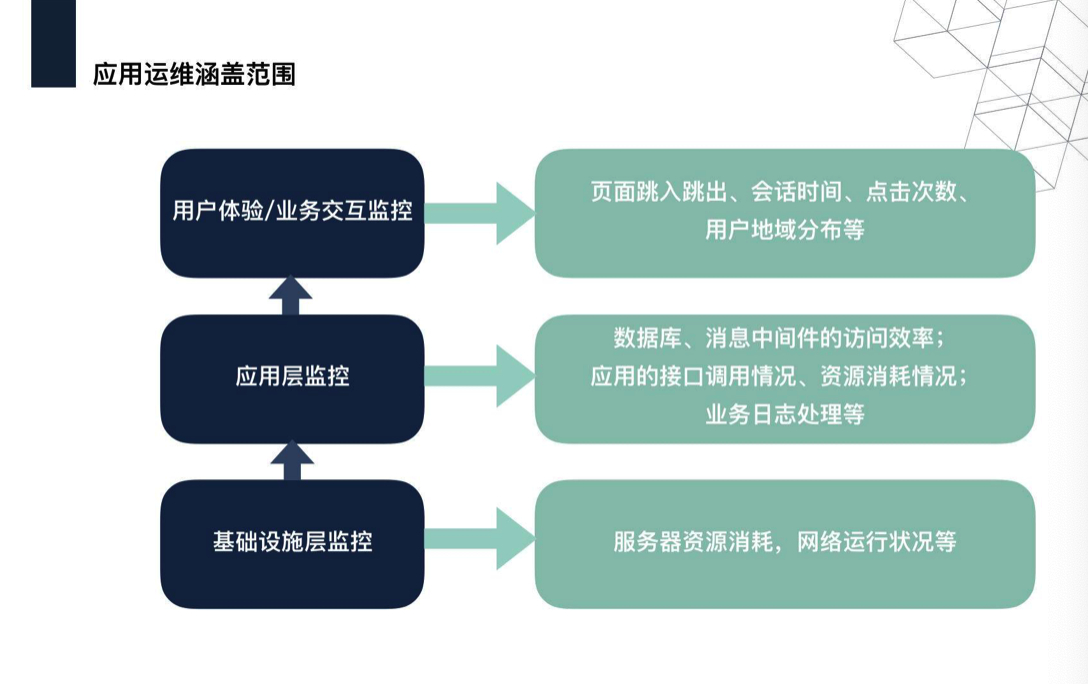 目前的运维工具逐渐地朝以应用为中心发展,因为应用是直接向用户提供业务能力的,无论是开发还是运维,都是被业务价值驱动的。主流的运维工具主要涵盖基础设施层监控、应用层面监控、业务层面的分析与监控。