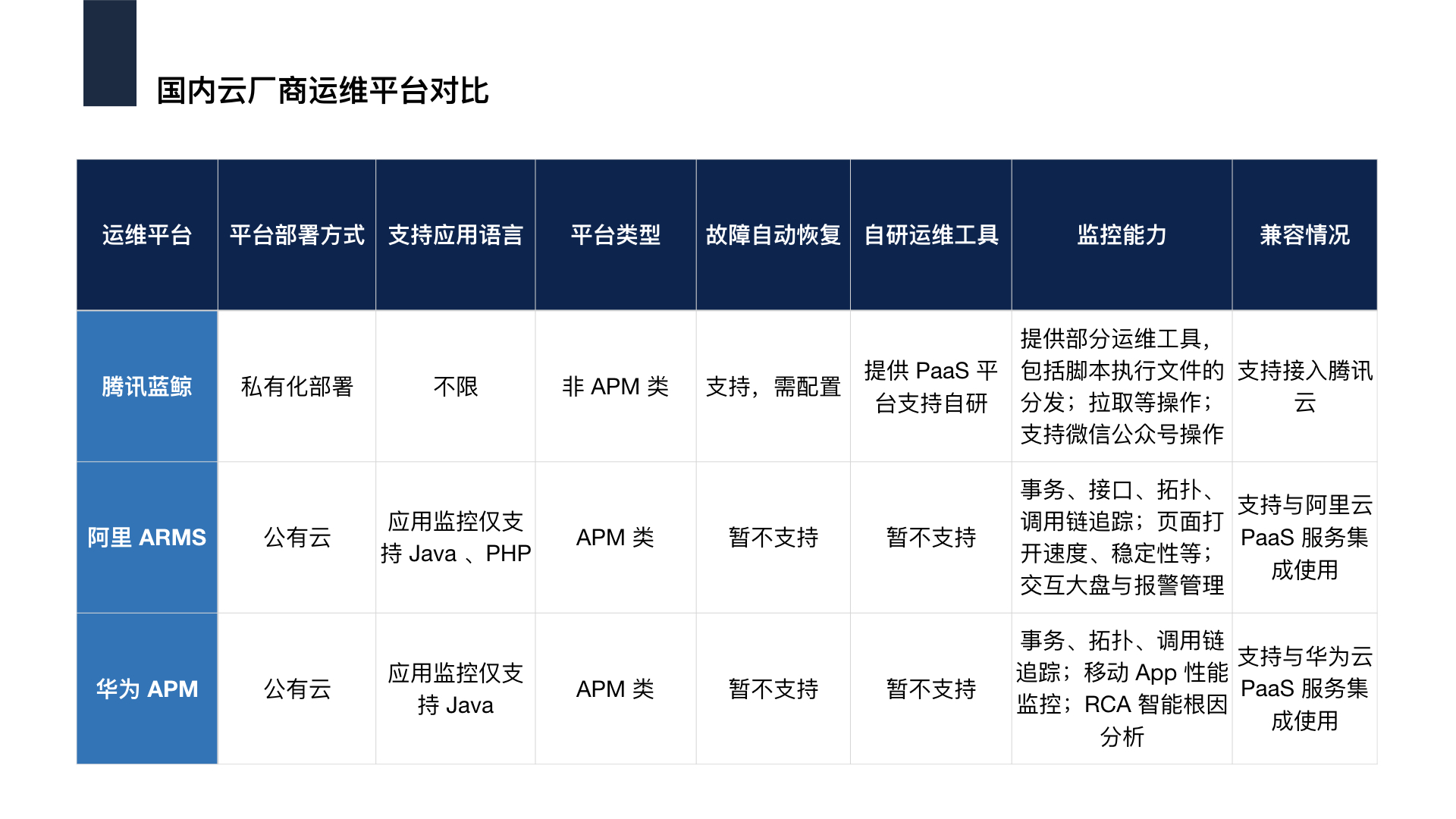 国外热度较高的运维工具包括 ZIPKIN(分布式追踪),pinpoint(分布式追踪),logstash(数据收集)等等。目前国内各大云厂商也基本都提供了应用运维平台,包括腾讯蓝鲸、阿里 ARMS、华为 APM 等。以下是这几个运维平台能力的简要对比: