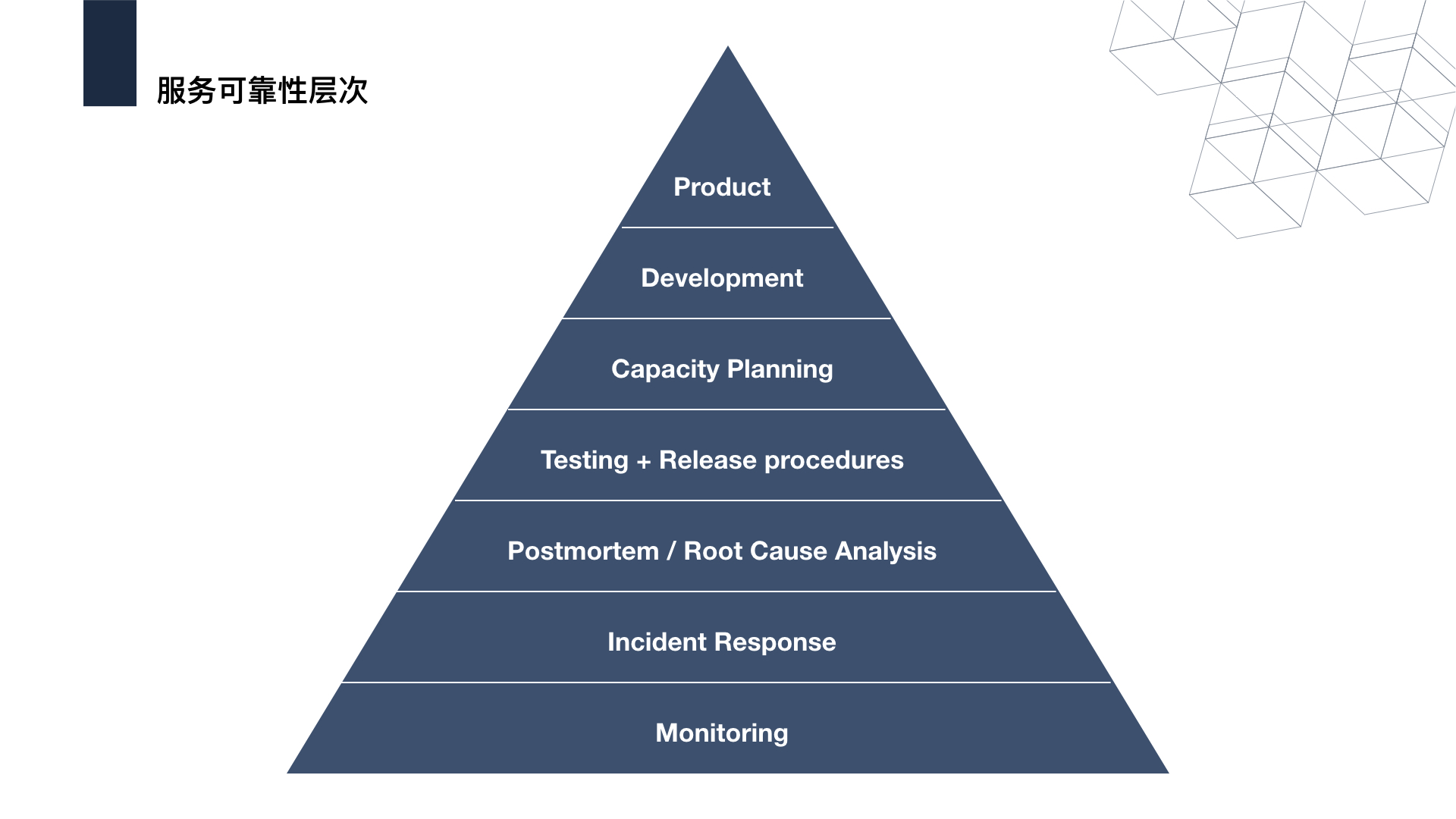 在 Google SRE 的服务可靠性层级当中,SRE 通过产品、开发、容量规划、测试、根因分析、事件响应、监控七个层次的实践来确保应用服务的健康状态。从这个层级当中我们可以看出 Google 提倡运维要积极控制服务发展的方向,而不仅仅在事故发生后反应性地灭火。目前来看,SRE 这种精英式的运维在国内还有待探索与实践。