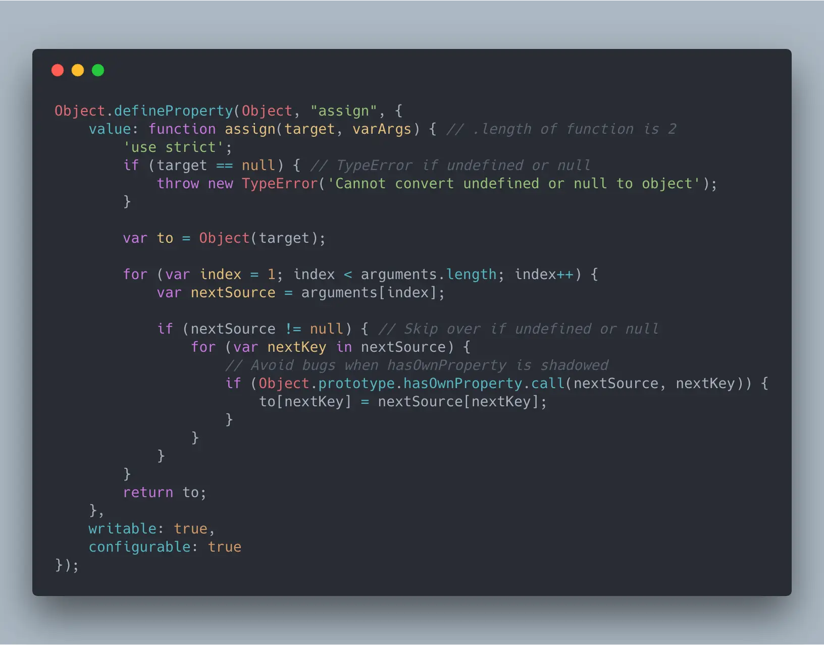 这样就能解释上面那个不符预期的结果了,Object.assign()拷贝的是属性值,如果属性值是对象,它只会拷贝引用值,也就造成了“覆盖”的假象了。既然知道了原因,我们是否可以搞一个assign的升级版,让它把引用值的属性也进行拷贝,刚好看到MDN里面有关于它的polyfill,代码如下--