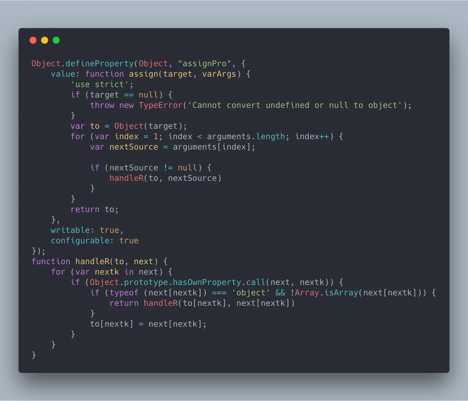 不难发现,assign的核心就是枚举对象的键值进行比对,然后得出拷贝的结果,那么我们的改造重心应该也是循环的这块内容。几经折腾,写了个assignPro方法--