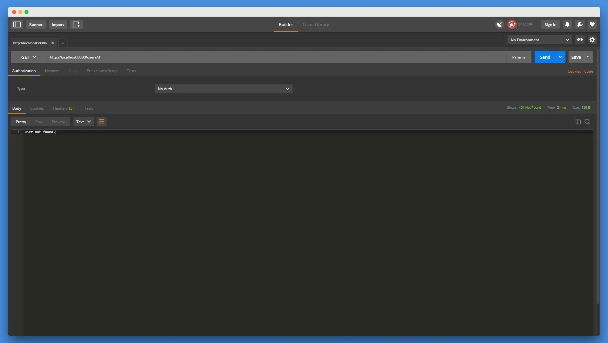 Postman的测试结果显示,请求状态为200,且返回了用户的详细信息。现在,我们更新URL为:http://localhost:8080/users/3 ,再次观察测试结果: