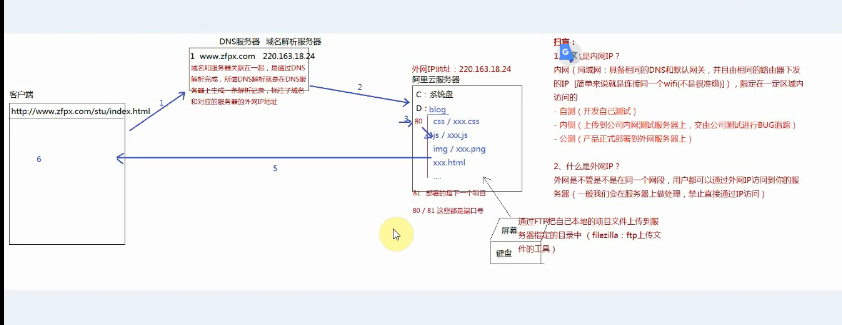 首先根据客户端输入的域名,到DNS服务器上进行反解析(通过服务器找到对应外网IP)