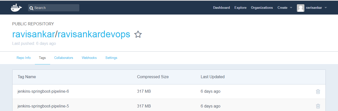 这个步骤构建 Docker 镜像。Docker build 命令将 dockerhub 仓库名称和 tag 名称作为一个参数,而构建位置作为另一个参数。