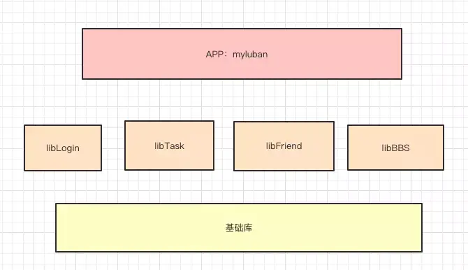 上面讲的模块划分既不属于模块化也不属于插件化,仅仅是一个简单package结构不同而已,app还是一个app并没有产生什么变化。通常讲的模块化,是指把业务划分为不同的moduler(类型是library),每个moduler之间都不依赖,app(类型是application)只是一个空壳依赖所有的moduler。