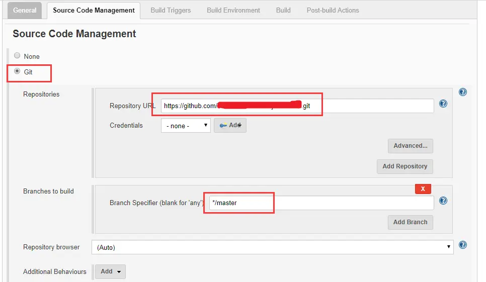 Source Code Management,选择 Git,填写 Repository URL,如果是私有仓库,还需要填写 Credentials( 点击 Add 添加)