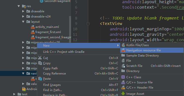 在 res 目录下新建 navigation 文件夹,然后新建一个 navigation 资源文件(需要 Android Studio3.2以上版本)