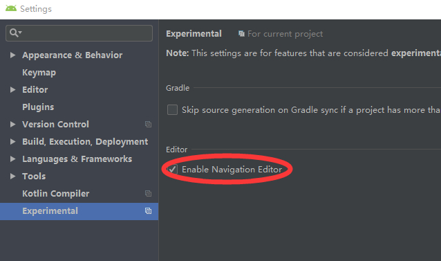 第一步:想要使用 Navigation,首先要将 Android Studio 升级到 3.2 版本,然后在 Settings 中最后一行找到 Experimental,对右侧 Enable Navigation Editor 打钩,如下图所示,然后重启 studio 使设置生效。