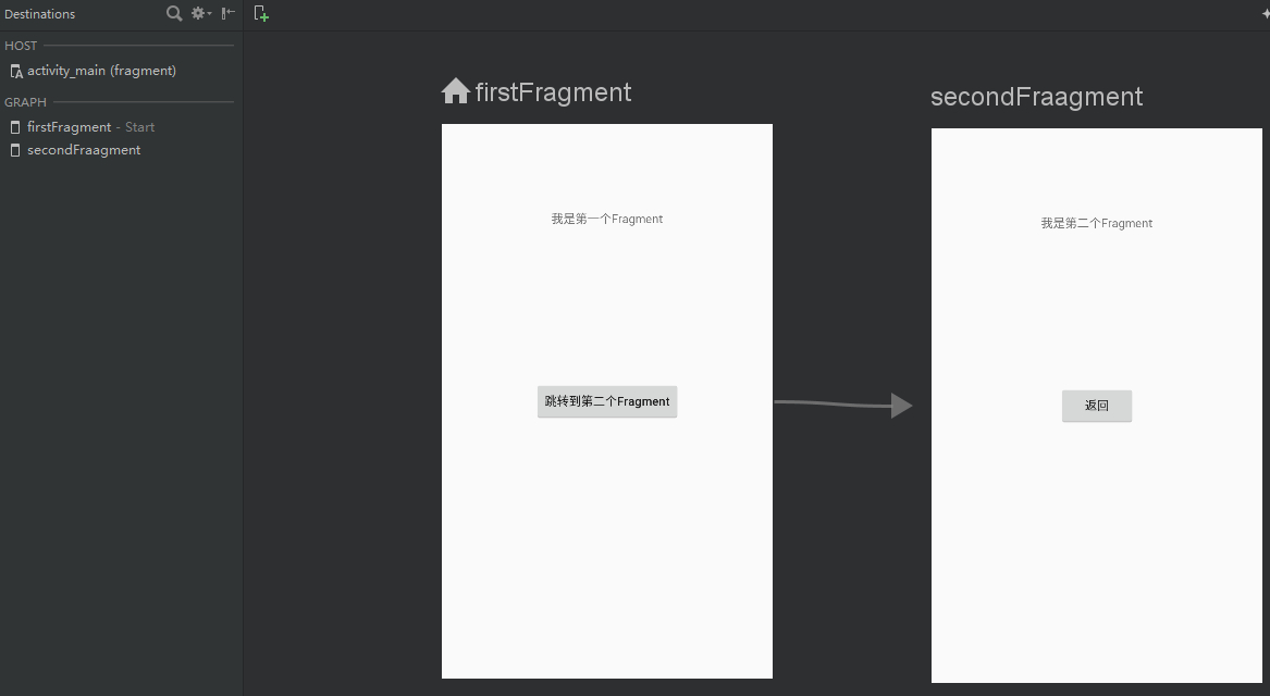 打开资源文件,然后切换为可视化模式,将两个已经创建好的 Fragment 添加进去,用箭头连接它们,这样就为它们绑定了跳转事件。