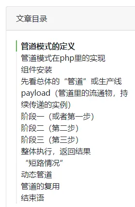这样来写,同样也让你在“可测试性”上,以及单一职责原则上,获得巨大胜利——因为你现在每一块代码只做一件事儿,或者相关的两件也行,然后就传给下一个类了,职责非常简单清晰。这样整个流程的每一步都是可测试的,都可以轻易mock,甚至整个的管道流程也是可测试的。