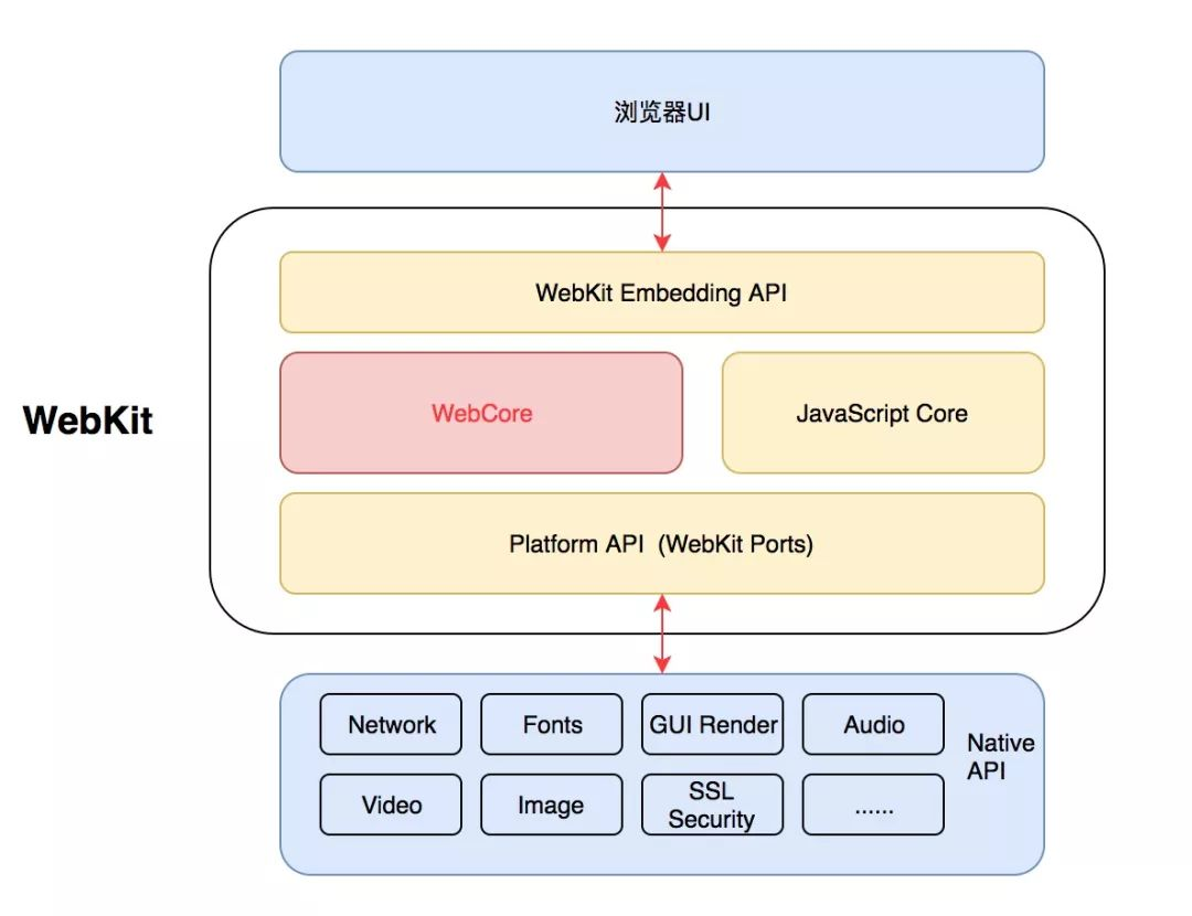 简单点讲,WebKit就是一个页面渲染以及逻辑处理引擎,前端工程师把HTML、JavaScript、CSS这“三驾马车”作为输入,经过WebKit的处理,就输出成了我们能看到以及操作的Web页面。从上图我们可以看出来,WebKit由图中框住的四个部分组成。而其中最主要的就是WebCore和JSCore( 或者是其它JS引擎),这两部分我们会分成两个小章节详细讲述。除此之外,WebKit Embedding API是负责浏览器UI与WebKit进行交互的部分,而WebKit Ports则是让Webkit更加方便的移植到各个操作系统、平台上,提供的一些调用Native Library的接口,比如在渲染层面,在Android系统中,Webkit则是交给Skia。