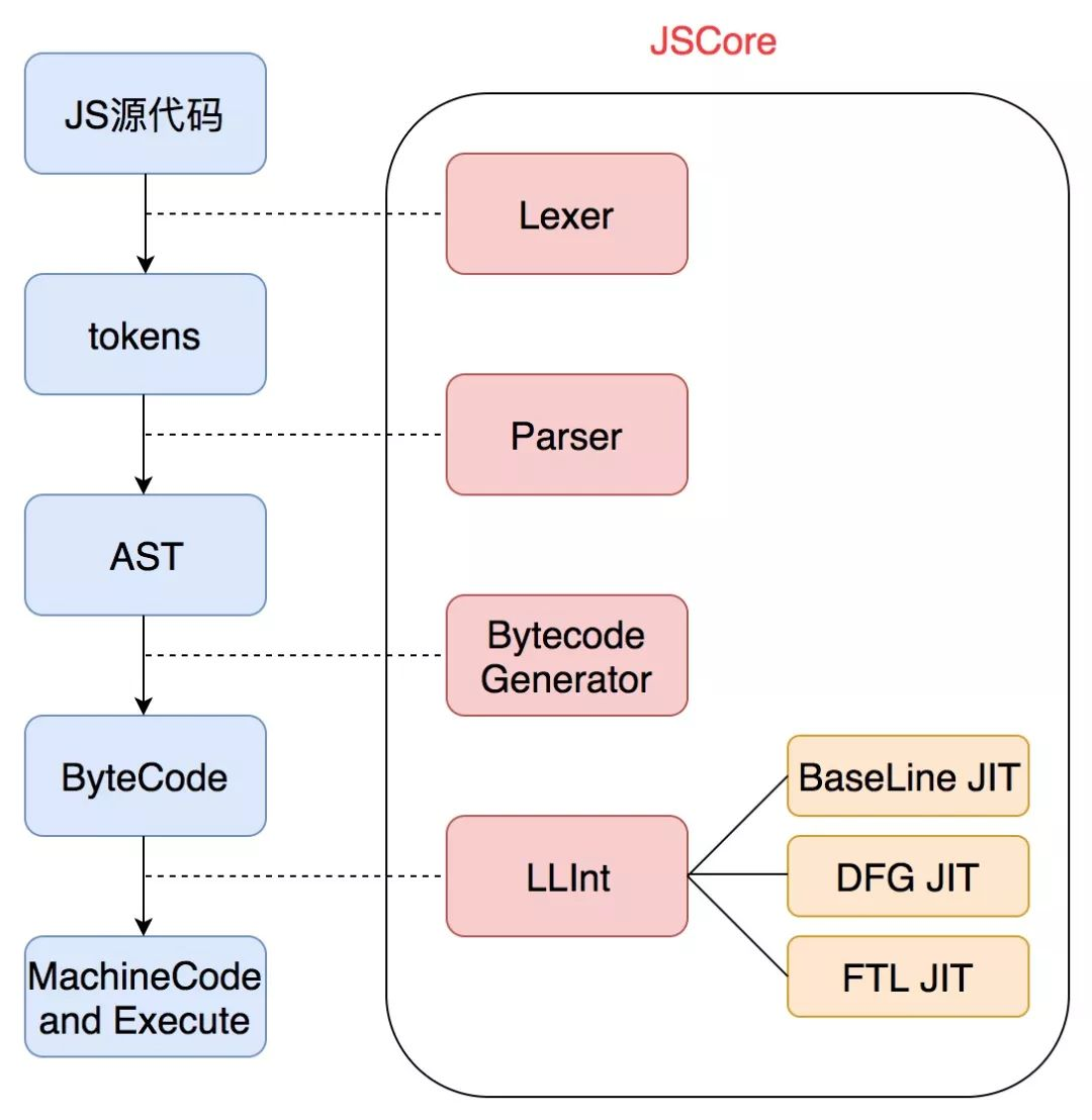 从功能上来看,一个高级语言虚拟机主要分为两部分,一个是解释器部分,用来运行高级语言编译生成的ByteCode,还有一部分则是Runtime运行时,用来负责运行时的内存空间开辟、管理等等。实际上,JSCore常常被认为是一个JS语言的优化虚拟机,它做着JVM类似的事情,只是相比静态编译的Java,它还多承担了把JS源代码编译成字节码的工作。