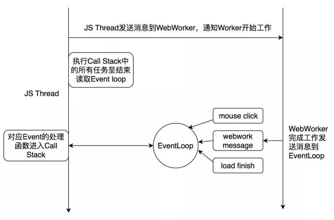 JS线程和工作线程,以及浏览器事件之间的通信机制叫做事件循环(EventLoop ),类似于Android的Looper。它有两个概念,一个是Call Stack,一个是Task Queue。当工作线程完成异步任务之后,会把消息推到Task Queue,消息就是注册时的回调函数。当Call Stack为空的时候,主线程会从Task Queue里取一条消息放入Call Stack来执行,JS主线程会一直重复这个动作直到消息队列为空。
