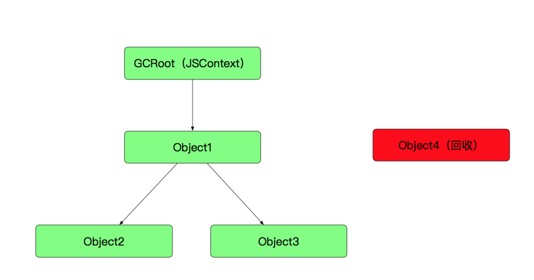JS同样也不需要我们去手动管理内存。JS的内存管理使用的是GC机制(Tracing Garbage Collection )。不同于OC的引用计数,Tracing Garbage Collection是由GCRoot(Context )开始维护的一条引用链,一旦引用链无法触达某对象节点,这个对象就会被回收掉。如下图所示: