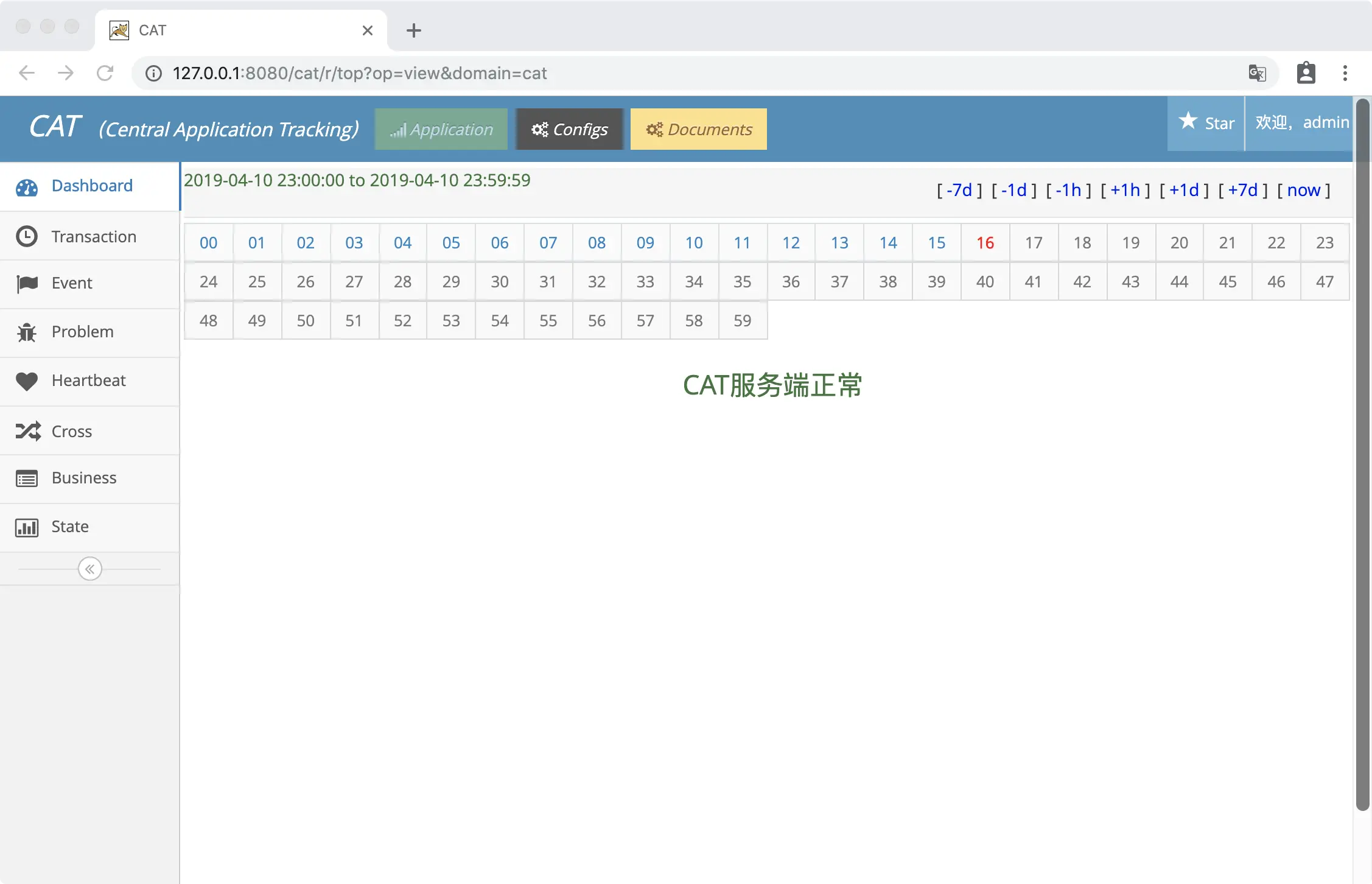 - 启动tomcat,打开控制台的URL,http://127.0.0.1:8080/cat/s/config?op=routerConfigUpdate 默认用户名:admin 默认密码:admin 。