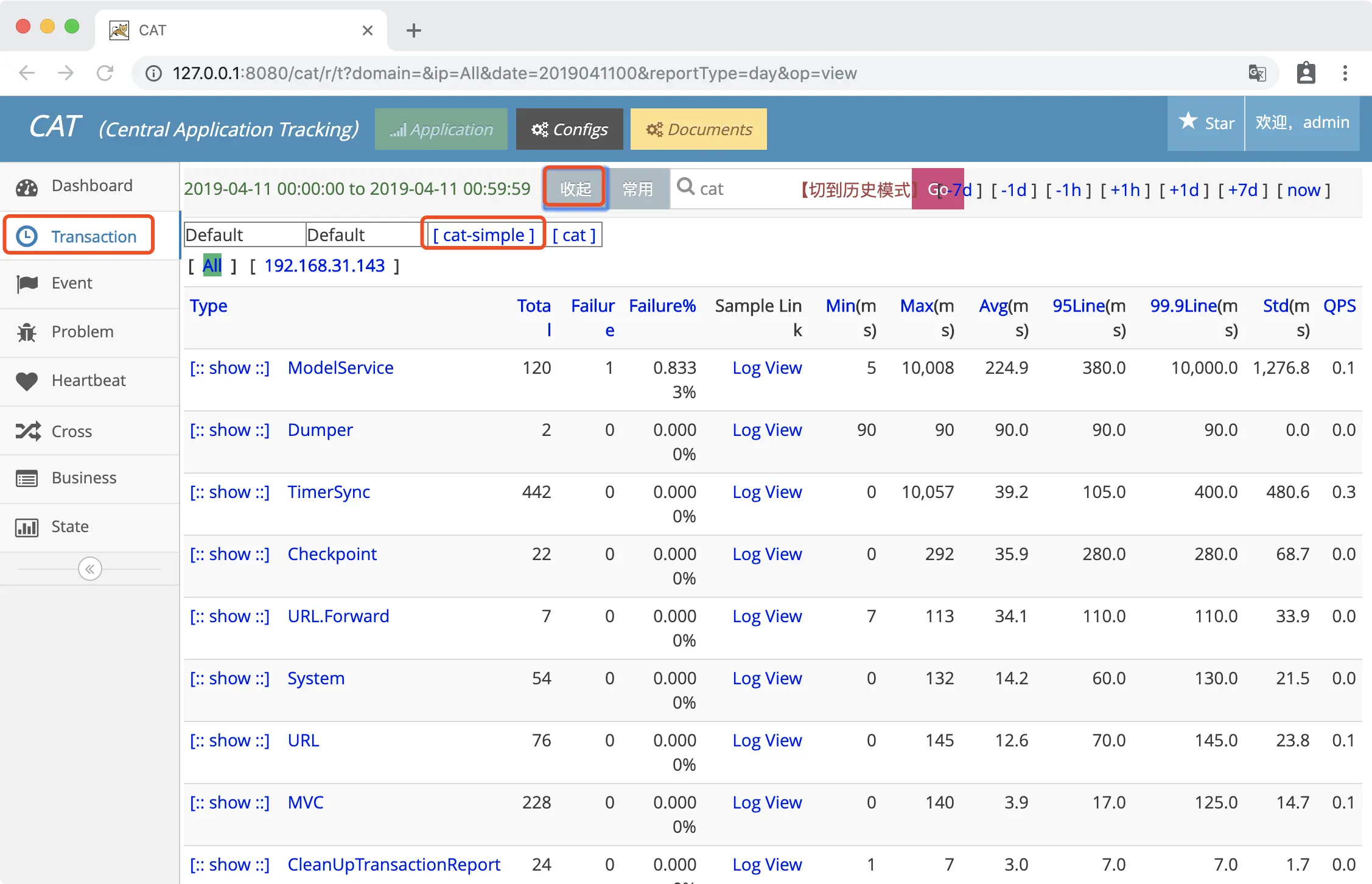 进入 cat 控制台,点击 Transaction 按钮 ,之后点击全部,会看到有哪些客户端,如图: