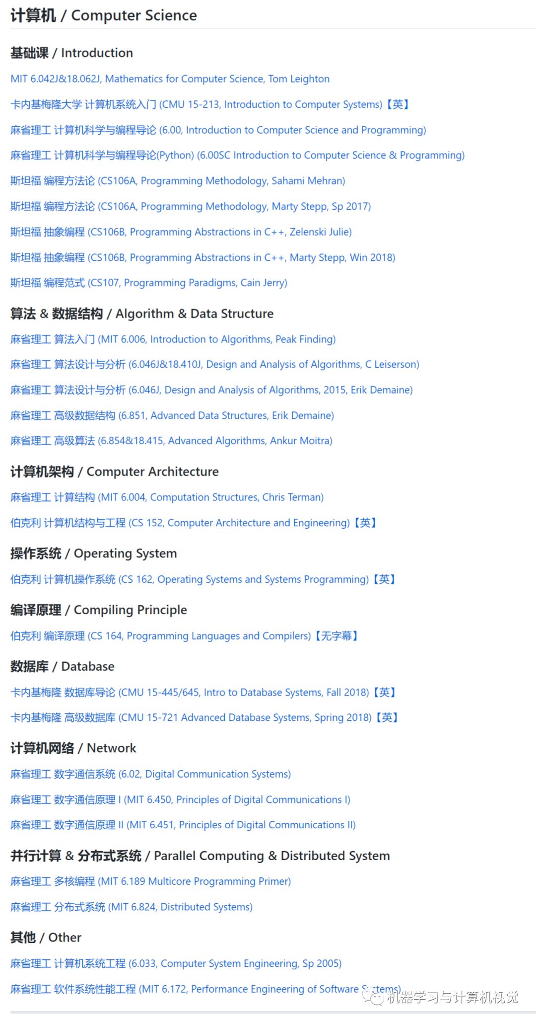 其中,计算机的课程如下所示,包括了很多来自斯坦福、麻省理工、伯克利、卡内基梅隆大学的课程!