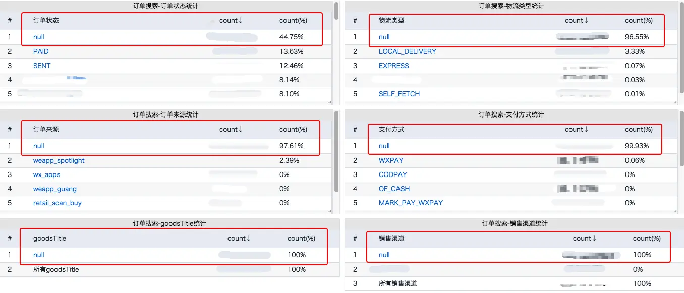 而细化了下这 53% 的订单状态搜索中,其中 3% 左右搜索终态订单(已完成,已关闭),其中 50% 所有流量全部都是搜热状态订单(待付款,待发货,待成团,待接单,已发货),-_- 忽略比较乱的枚举,历史多个版本统计合一。
