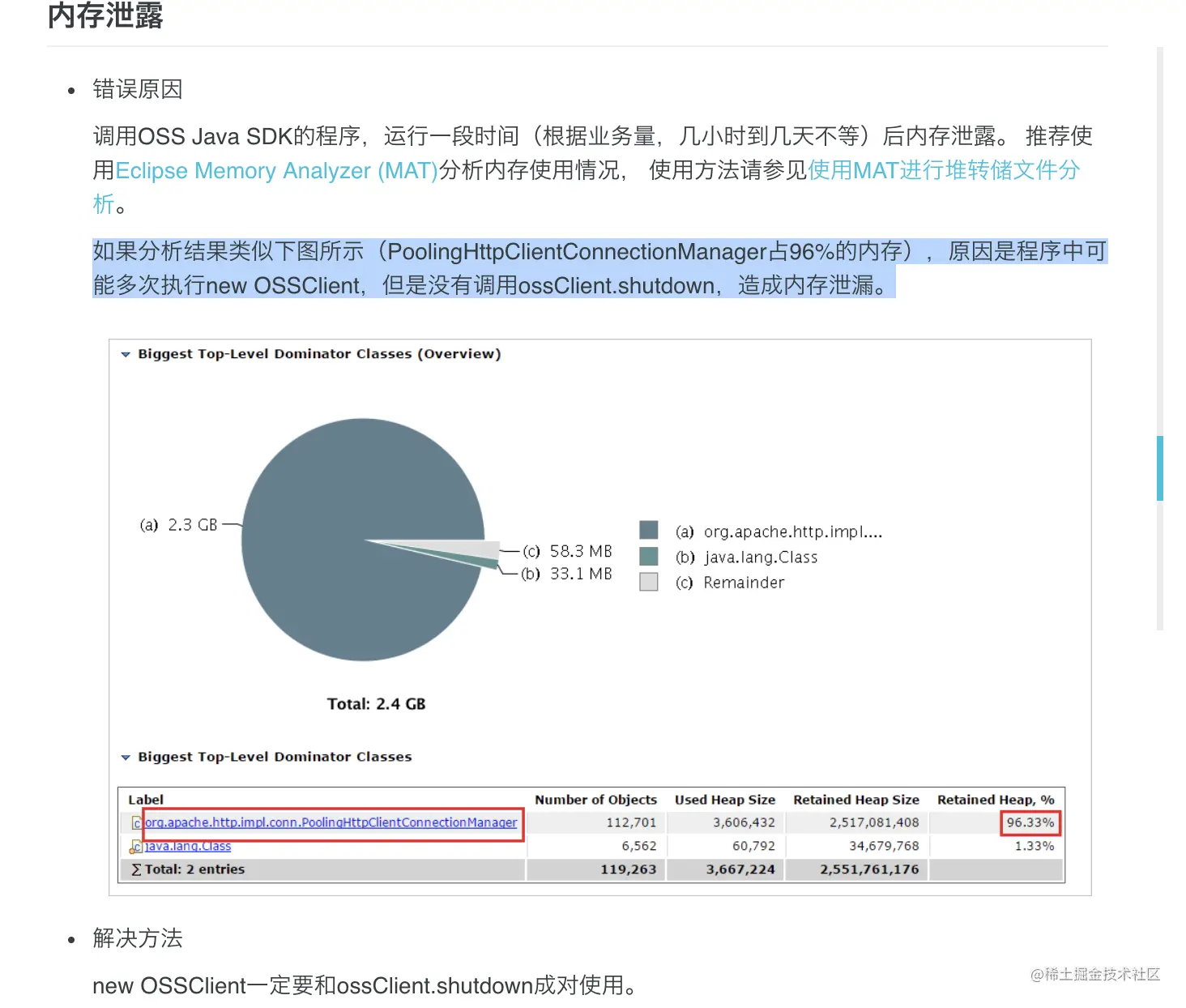 分析一下,在判断oss路径是否存在的时候,也就是调用boolean objectExist = ossHelper.objectExist(url);方法时,每次都会创建一个oss的链接,而我们的文件是很多的,所以每个文件返回访问链接的时候都会调用这个方法,所以创建的oss的链接是巨多的!!! 查询资料发现,如下网友也中招:
