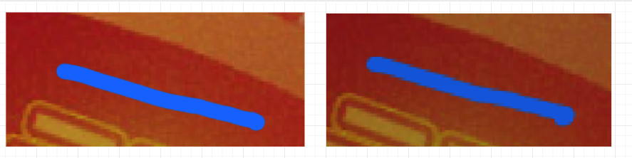 左边是正在绘制时(即手指在屏幕中滑动)的效果,线条圆滑,因为View画布的分辨率相当于屏幕分辨率,所以绘制出来的线条也清晰。而右边是绘制结束时(即手指抬起后)的效果,线条边缘出现锯齿,因为图片的分辨率较低,因此绘制在图片上的线条较模糊。