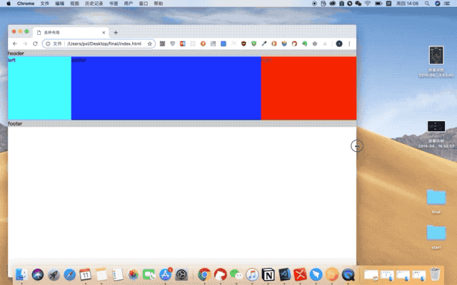 - 缩小或者拉大屏幕,左栏和右栏的宽度保持不变,中间的宽度随着变小或变大