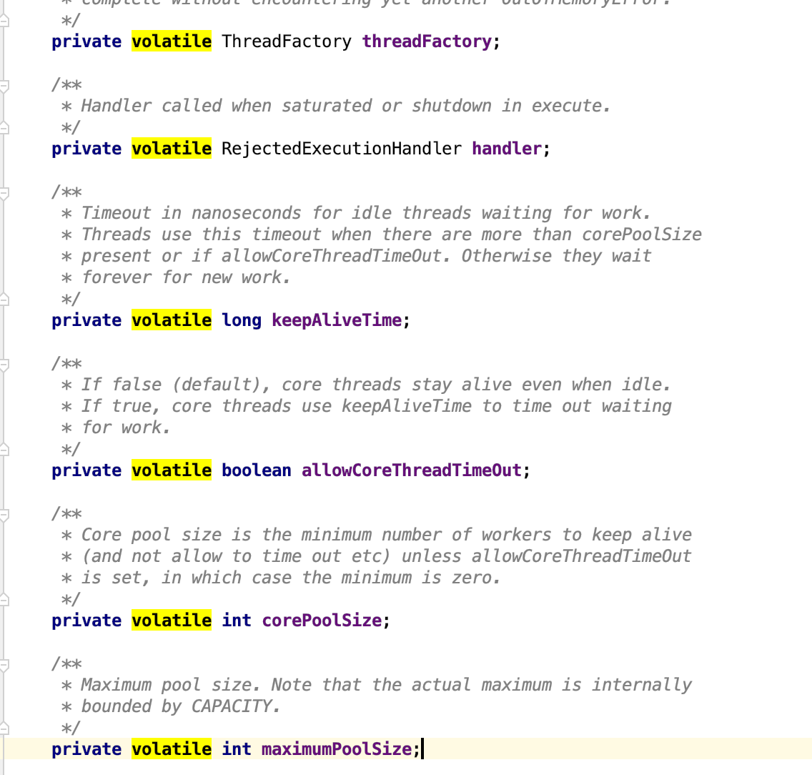 ThreadPoolExecutor.CallerRunsPolicy:由调用线程处理该任务其中注意这几个参数都是volatile修饰的,用来保证多线程下的可见性,我们也可以根据这些参数的不同配置,来产生我们需要的线程池。