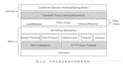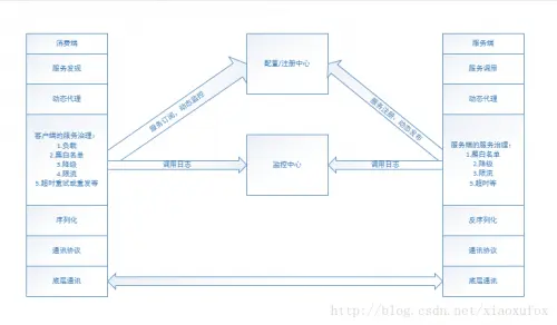 1 rpc层:底层的通讯框架,通讯协议,序列化和反序列化;2 服务发布订阅;3 服务治理;